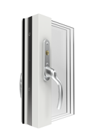 Vår utåtgående altandörr kan fås med med fyllning som linjerar med våra fönster eller som helglasad dörr. Dörren levereras med broms för att kunna låsas i öppet läget.